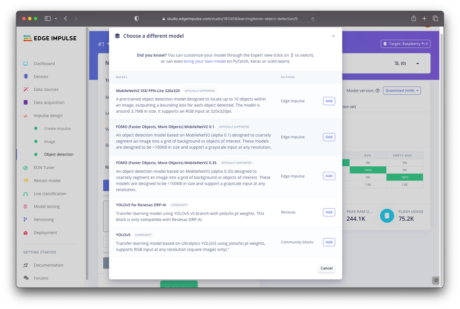 The important bit for this tutorial is to train an object detection model and to select the correct Yolo models. Work through the data acquisition and impulse creation steps in the Edge Impulse platform to get to the object detection model: