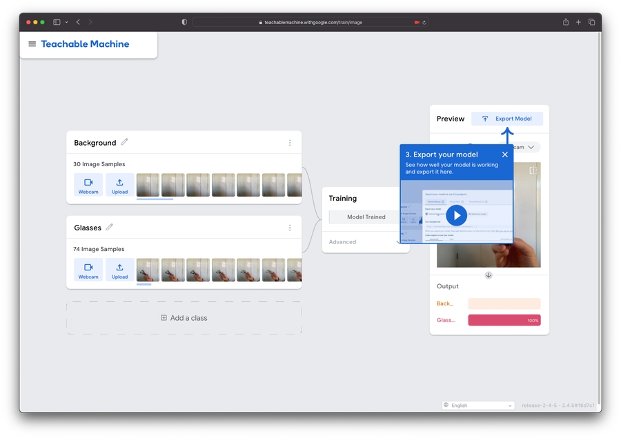Next, follow the Teachable machine instructions to train your image classification model. You can find useful instruction video's here.