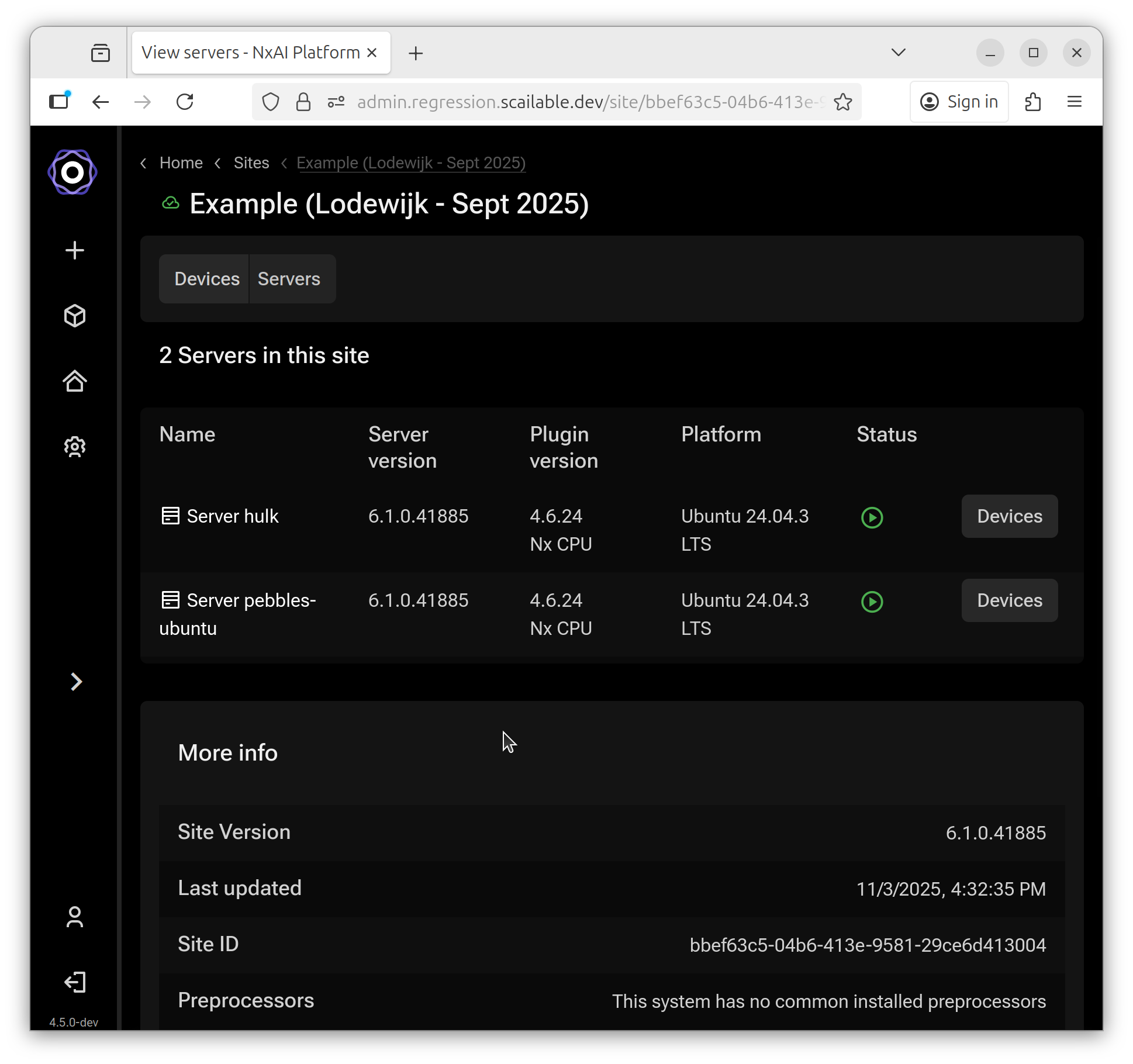 If the site is on-line the system shows up with a green icon and the "Devices" button is available.