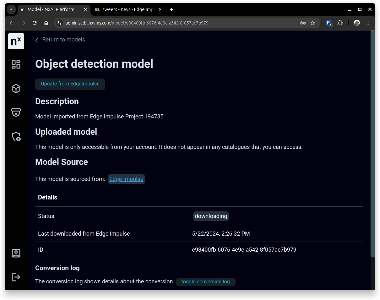 - Coupling your Edge Impulse model with Nx AI cloud. We will show how to sync your Edge Impulse model with your model catalog.