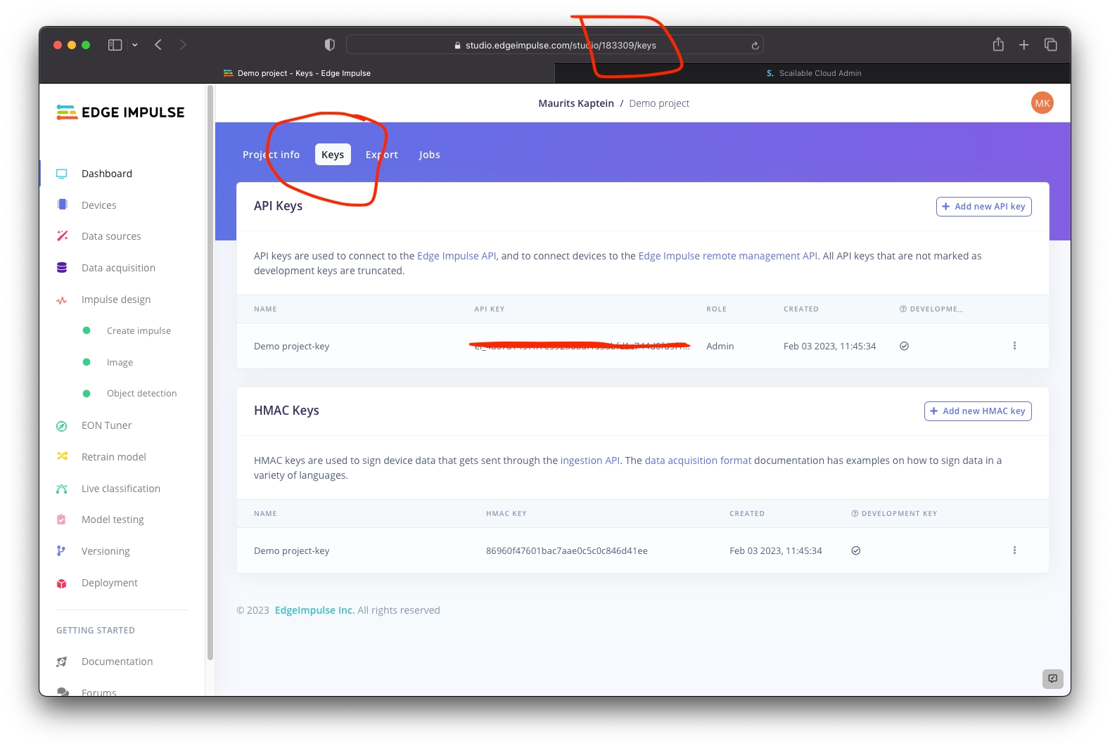 At this point you can use your Edge Impulse API key and project ID to import your trained model directly from Edge Impulse.