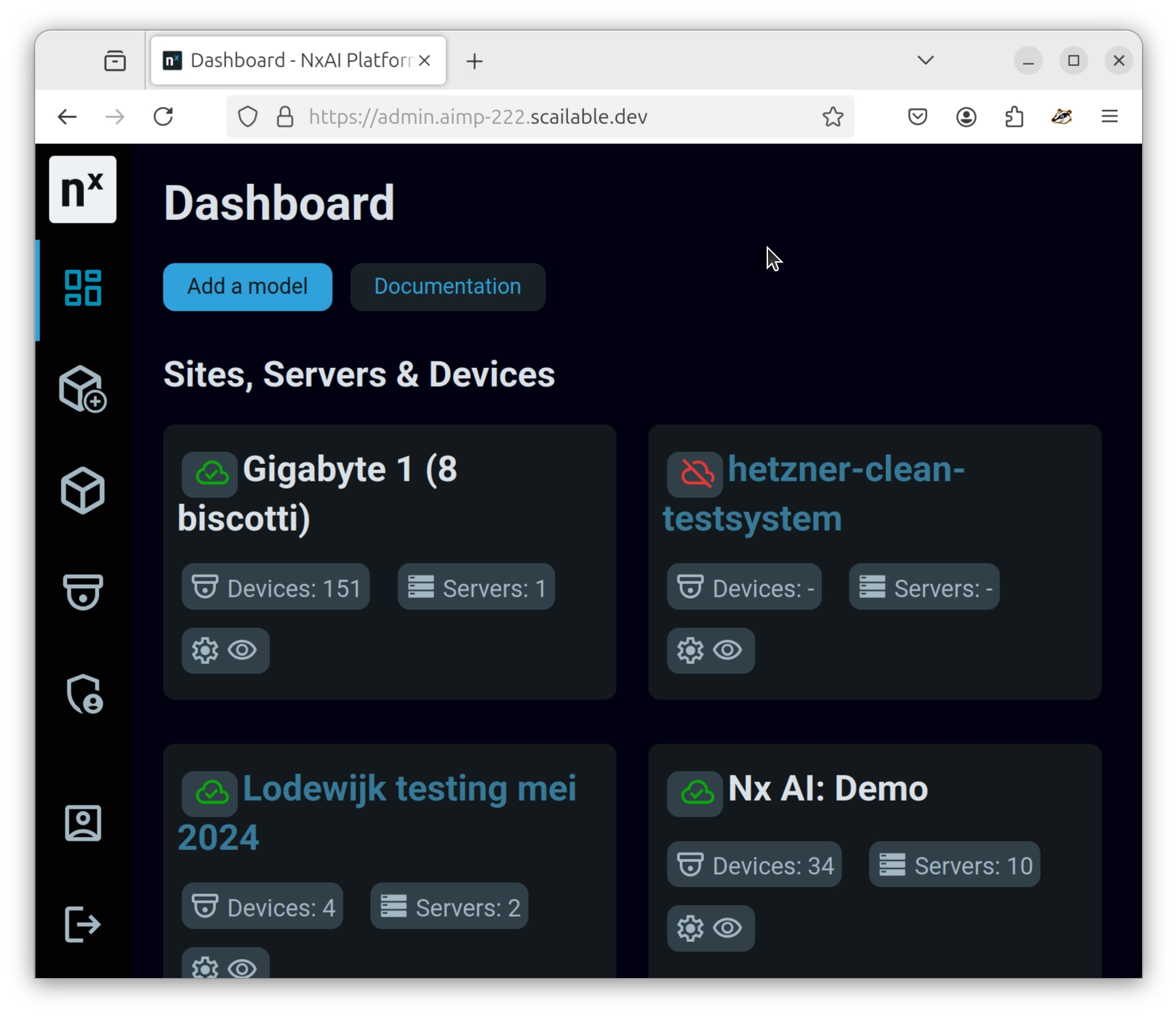 After you have created your model and made sure it conforms to the Nx ONNX requirements, you can easily upload it to make it available in Nx Cloud and, thereby, to all your Nx Servers. First, click on the "Add a model" button, top left: