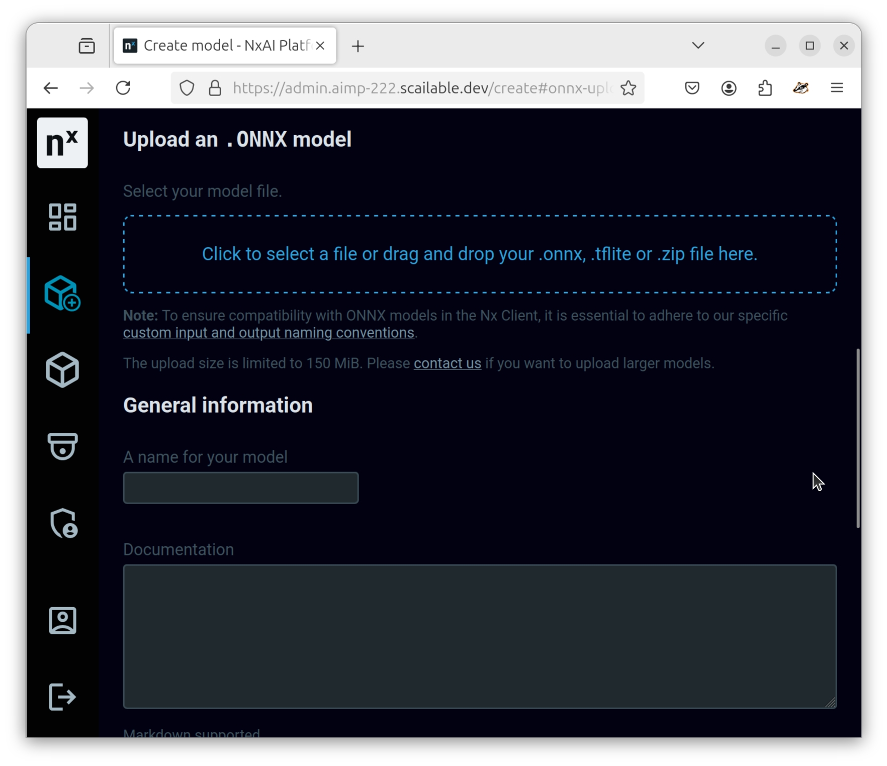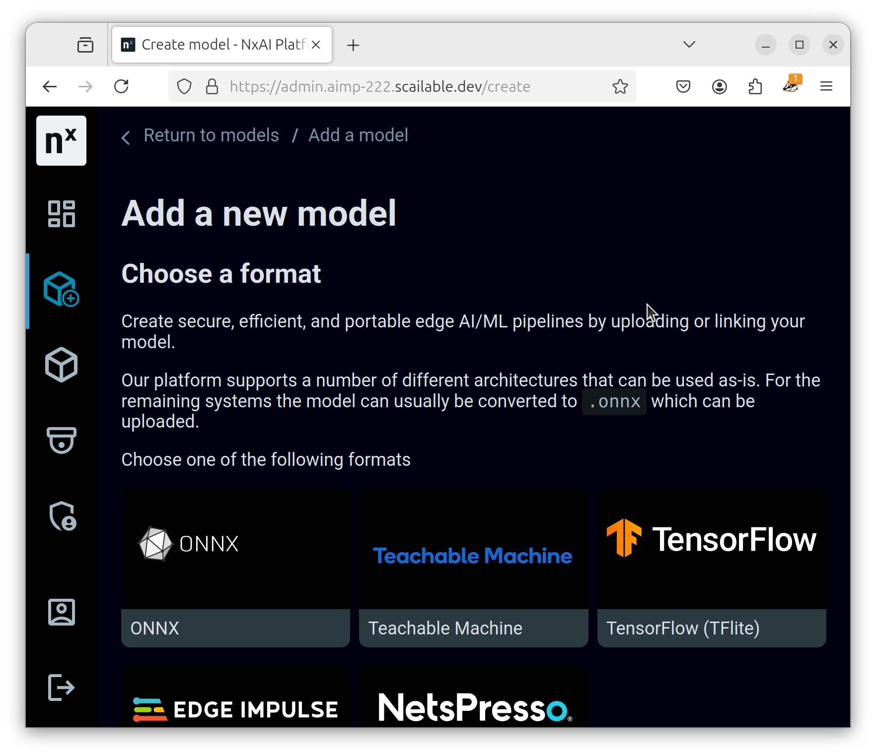 Next, choose (in the case of an ONNX model) the "ONNX" upload button: