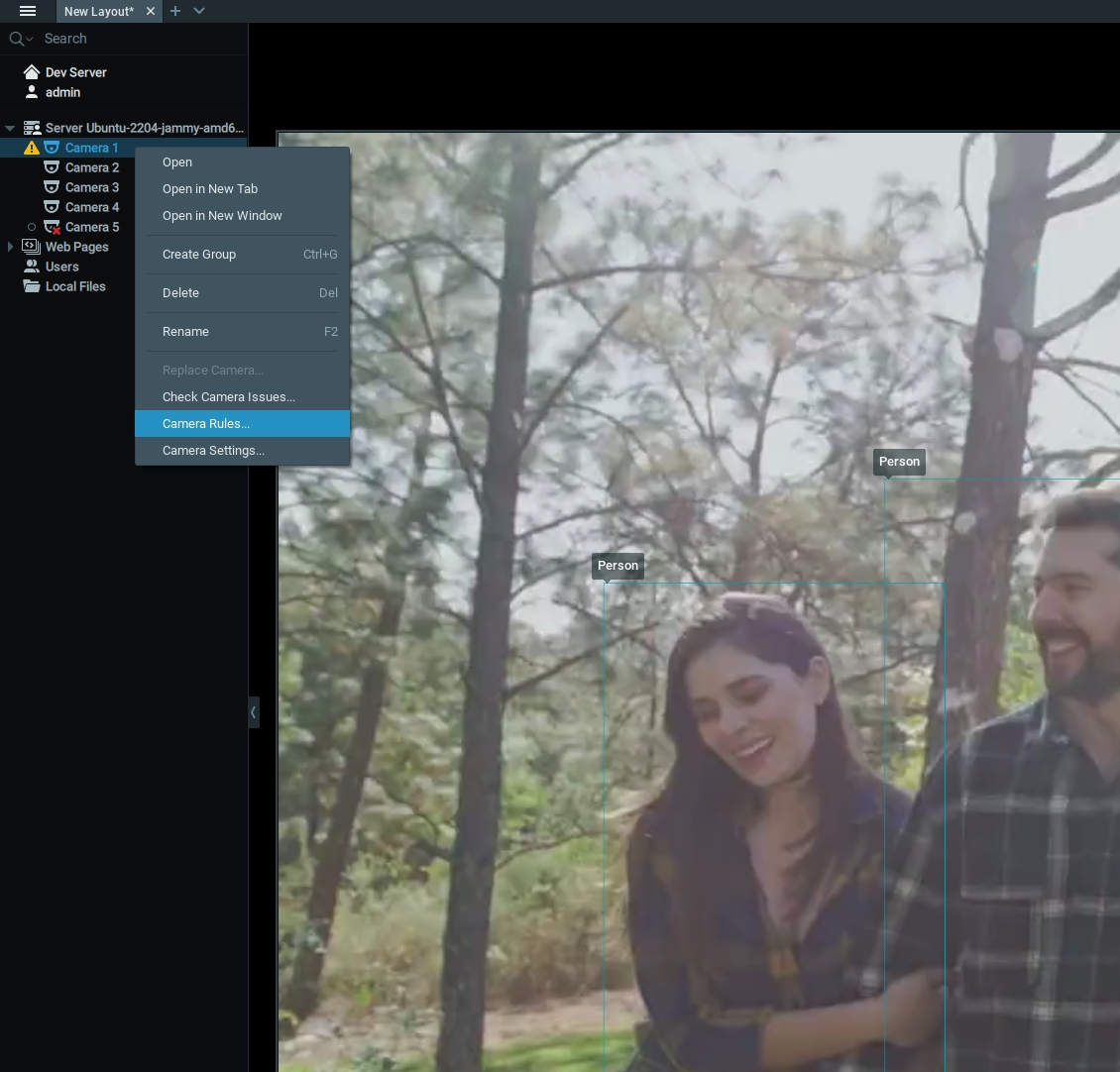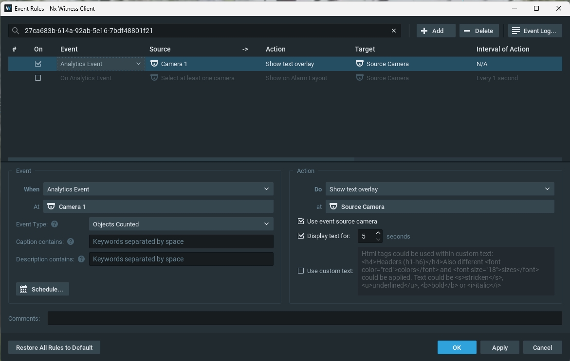 The Nx AI Manager plugin can generate several different types of events. Network Optix gives the user control over what these events should do, from sending an email to showing a notification. In this example, we will show a text overlay on the video.