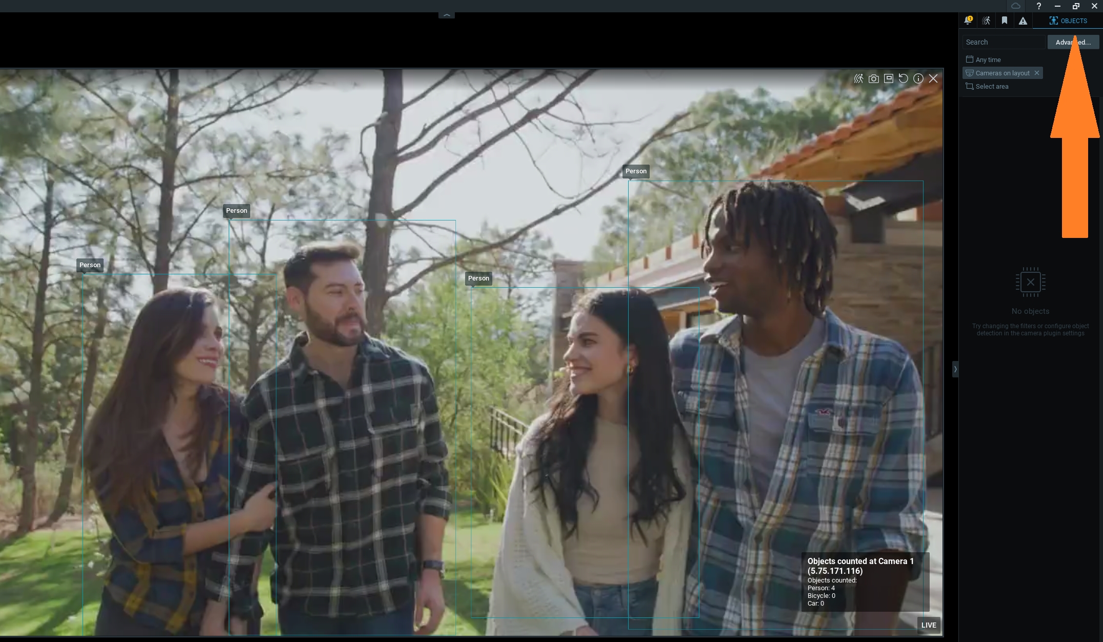 If a model that outputs compatible bounding boxes is selected and running the Edge AI Manager, bounding boxes can be visualized by visiting the Objects tab on the right pane in the Nx Meta Client: