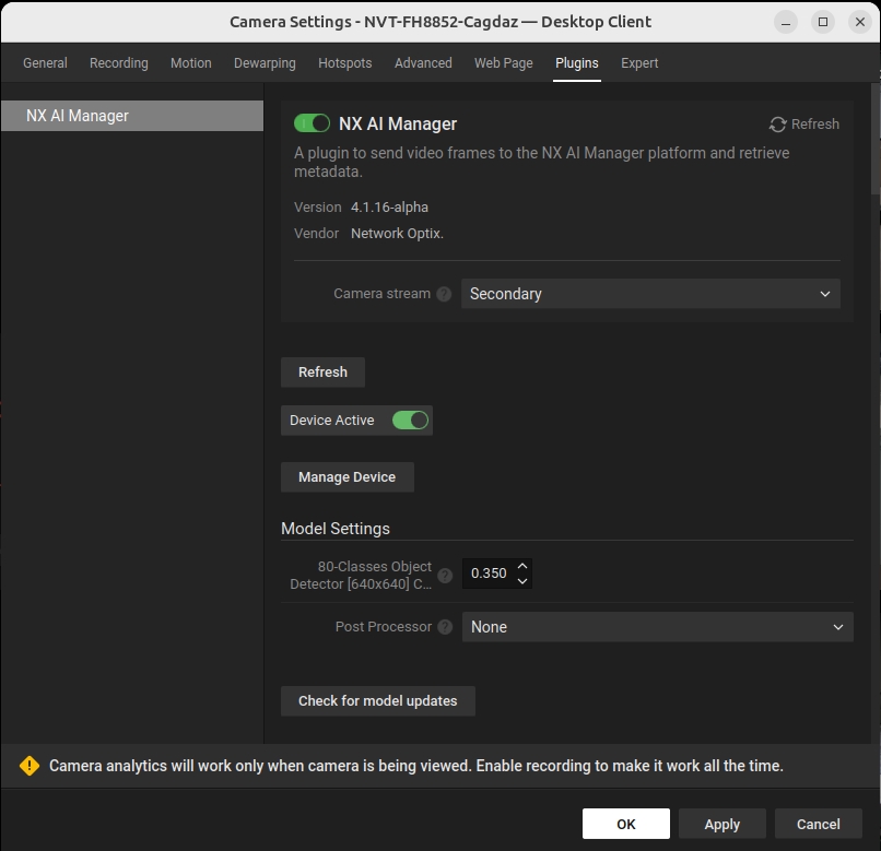 When opening the camera settings the Plugins tab is available, and on the Plugins tab the Nx AI Manager is present