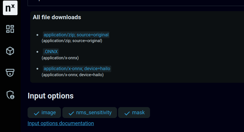 application/x-onnx; device=hailoorapplication/x-onnx; device=hailo-8lbased on the Hailo chip (Hailo-8 or Hailo-8L) model file in the Nx AI Cloud: